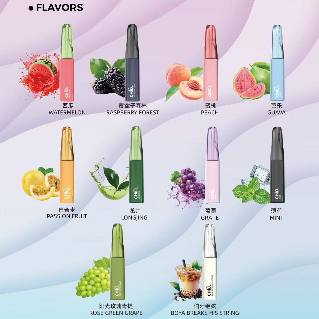 西瓜冰、覆盆子森林、蜜桃、芭樂、百香果、龍井、葡萄、薄荷、陽光玫瑰青提、伯牙絕弦