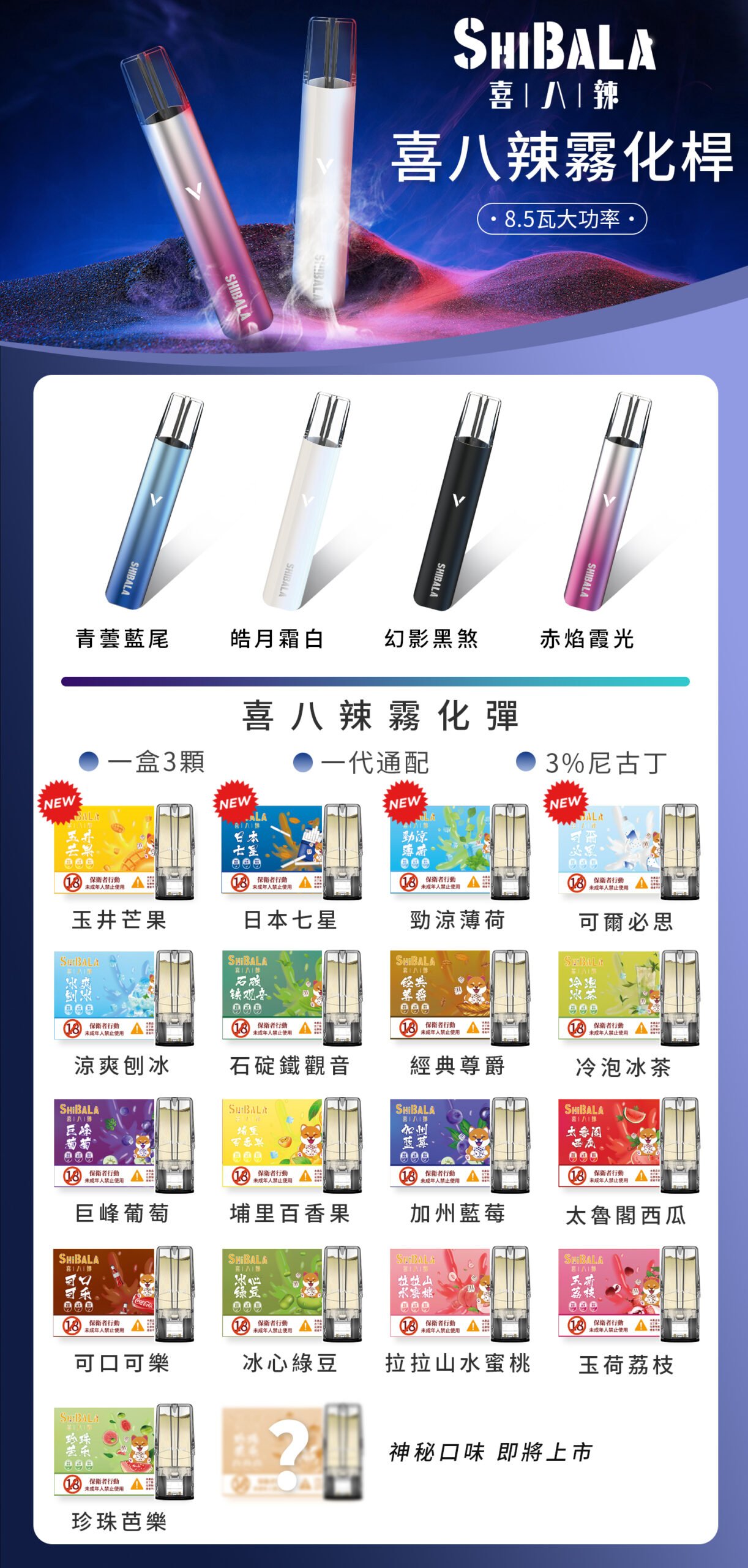 SHIBALA煙彈擁有高達22種口味選擇,涵蓋了極涼、普涼和不涼三大類型,滿足不同用户的口味需求。以下是部分口味列表: